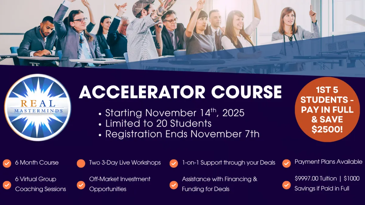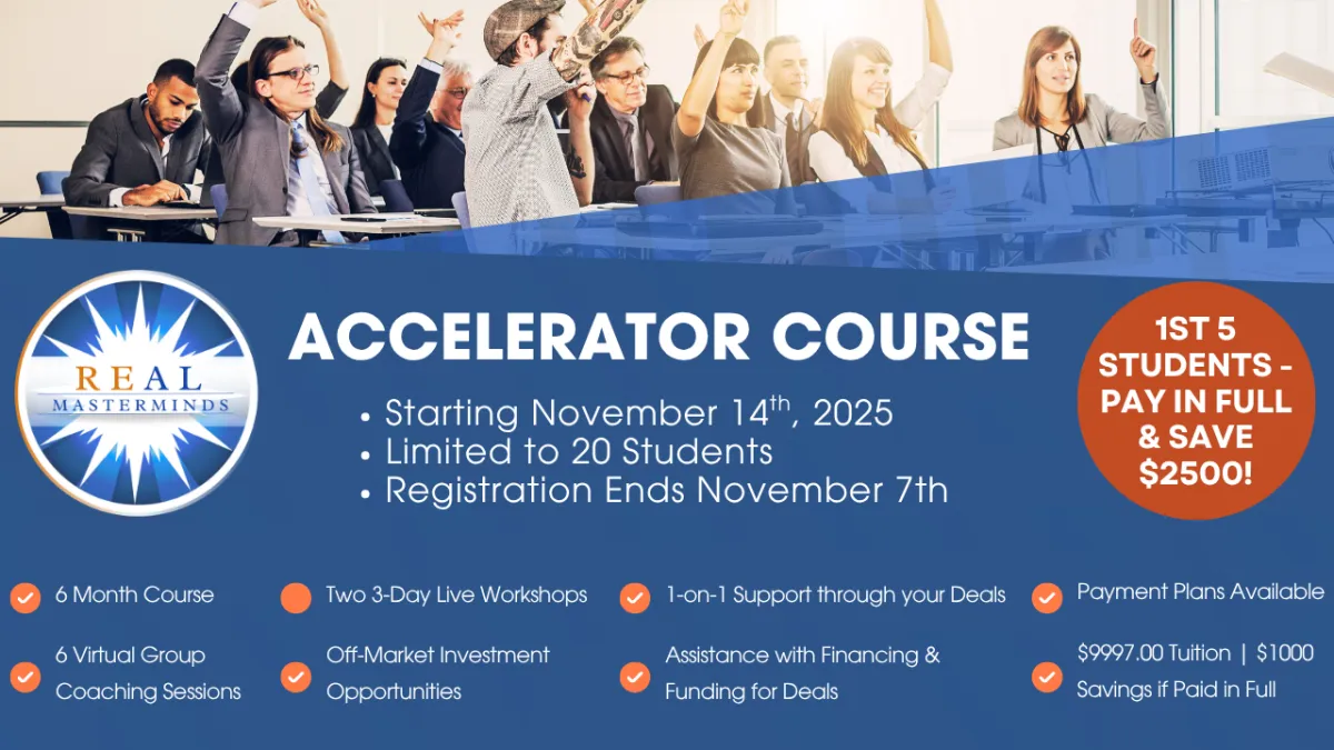 Don't just learn it - LIVE it with Real Masterminds Coaching! Choose the program that's right for you and take your first step toward financial freedom today. Space is limited in our Accelerator workshops, so don't wait.